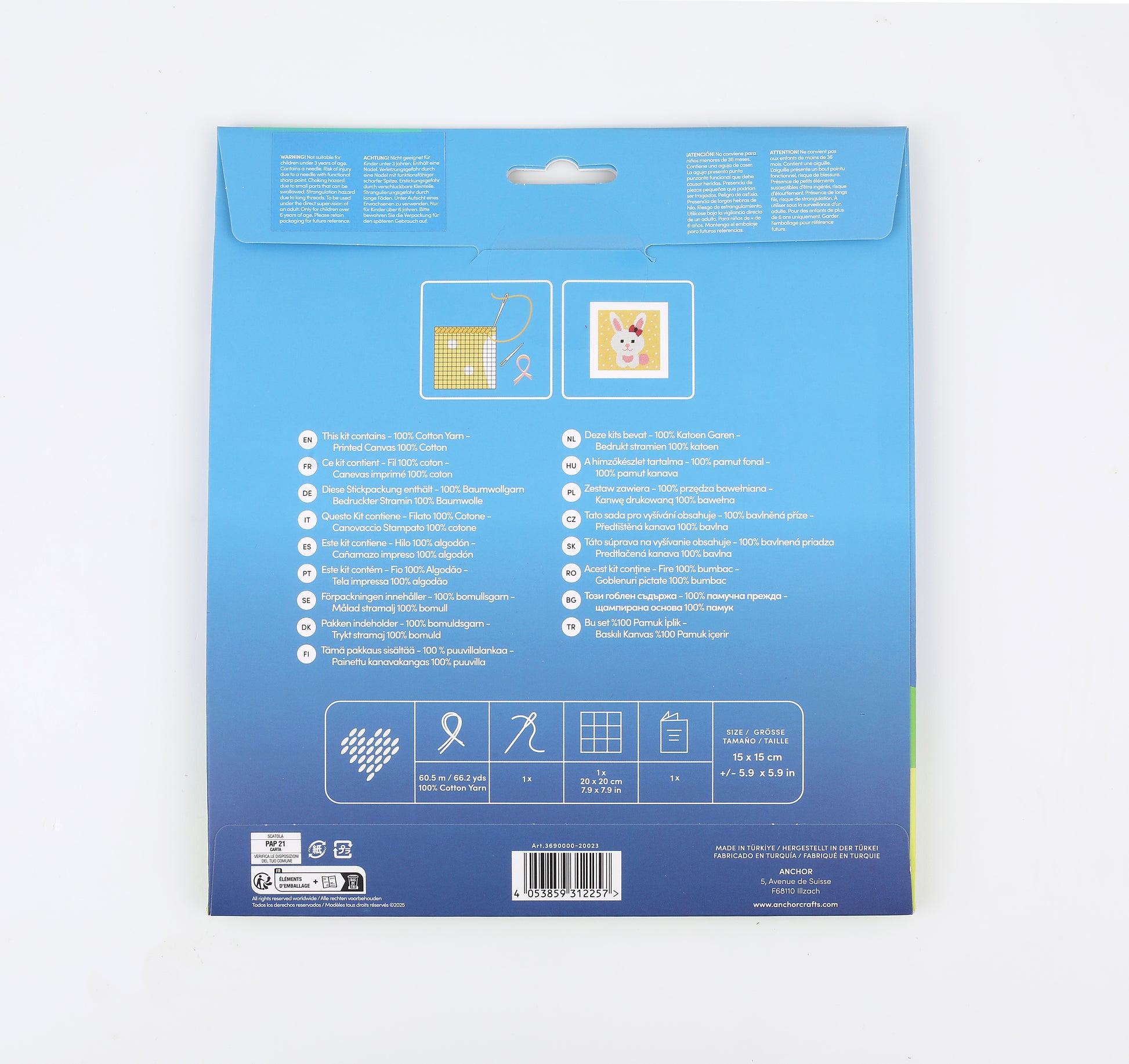 Remarque : Ne convient pas aux enfants de moins de 3 ans. Contient une aiguille à tapisserie bout rond. À utiliser sous la surveillance d'un adulte. Convient aux enfants de 6 ans et plus.