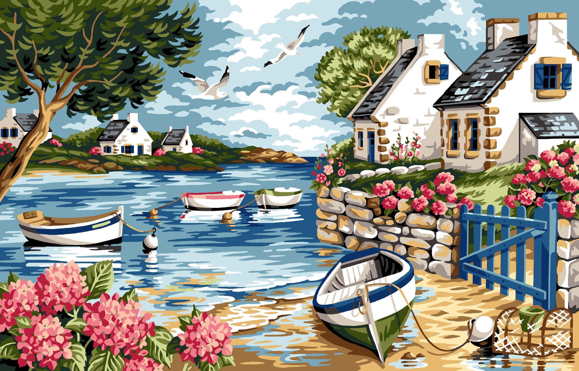 Cette toile détaillée représente un magnifique village côtier de Bretagne. Votre pièce finie sera magnifique encadrée sur un mur. Convient aux couturières expérimentées. Nos créations sont imprimées sur une toile 100% Coton .