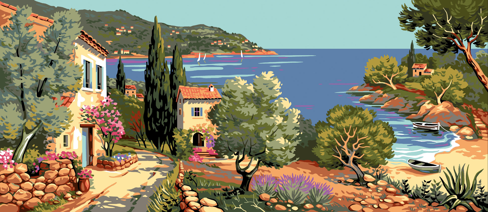 Cette toile détaillée présente un superbe panorama du littoral provençal. Votre pièce finie sera magnifique encadrée sur un mur. Convient aux couturières expérimentées. Nos créations sont imprimées sur une toile 100% Coton .