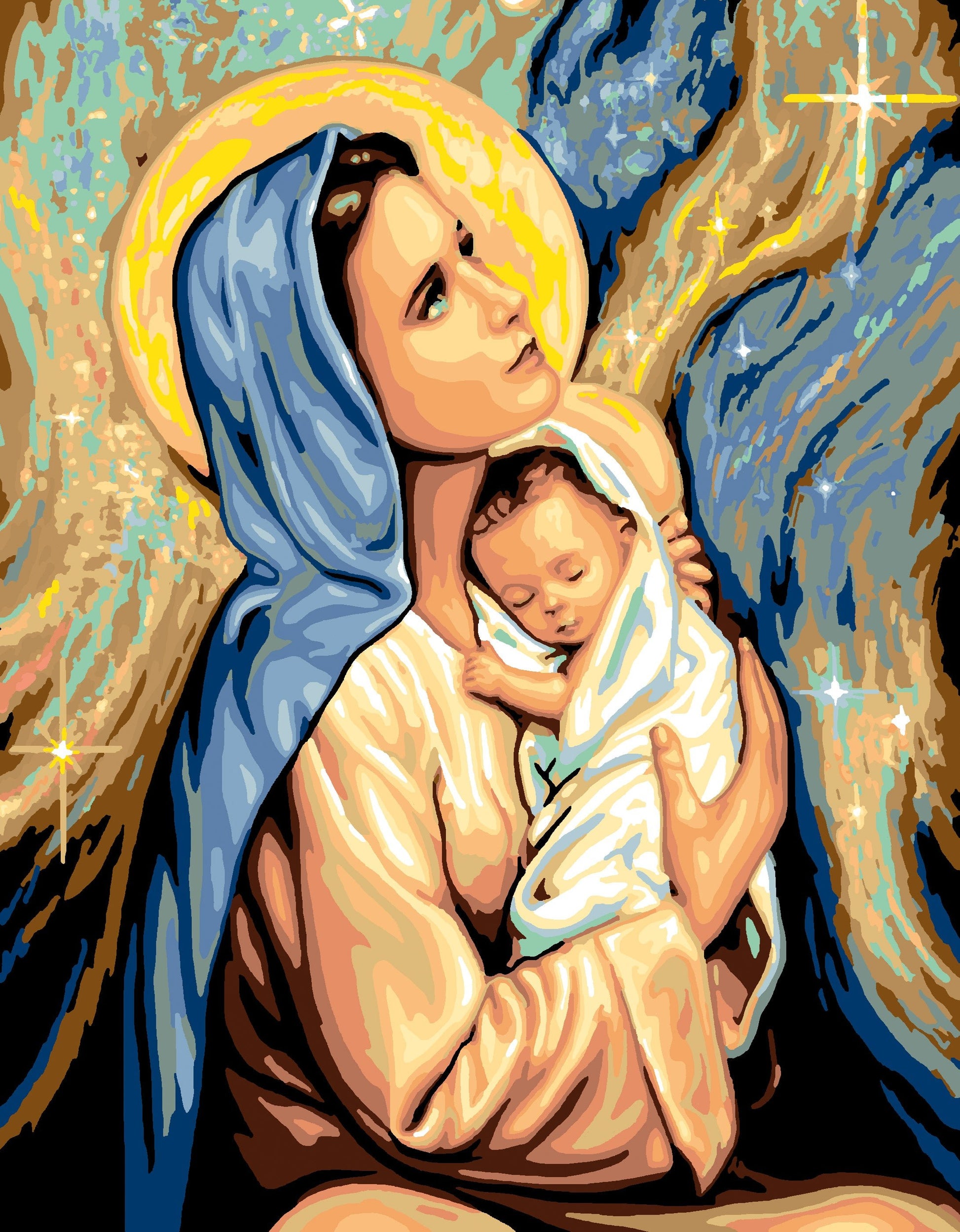 Cette toile détaillée représente la Vierge Marie tenant l'enfant Jésus. Votre pièce finie sera magnifique encadrée sur un mur. Convient aux couturières expérimentées. Nos créations sont imprimées sur une toile 100% Coton .