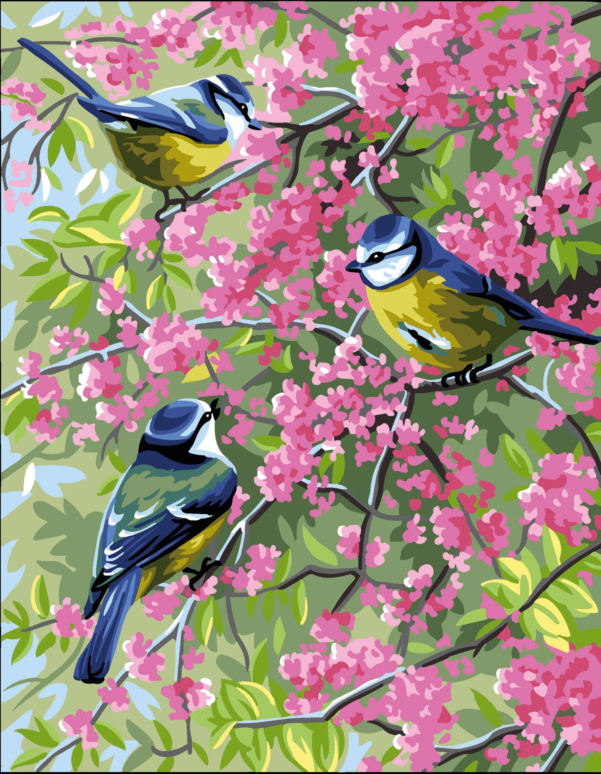 This detailed canvas features three blue chickadees perched on a gorgeous pink flowering blossom tree. Your finished piece will look beautiful framed on a wall. Suitable for experienced stitchers. Our designs are printed on a 100% cotton canvas.