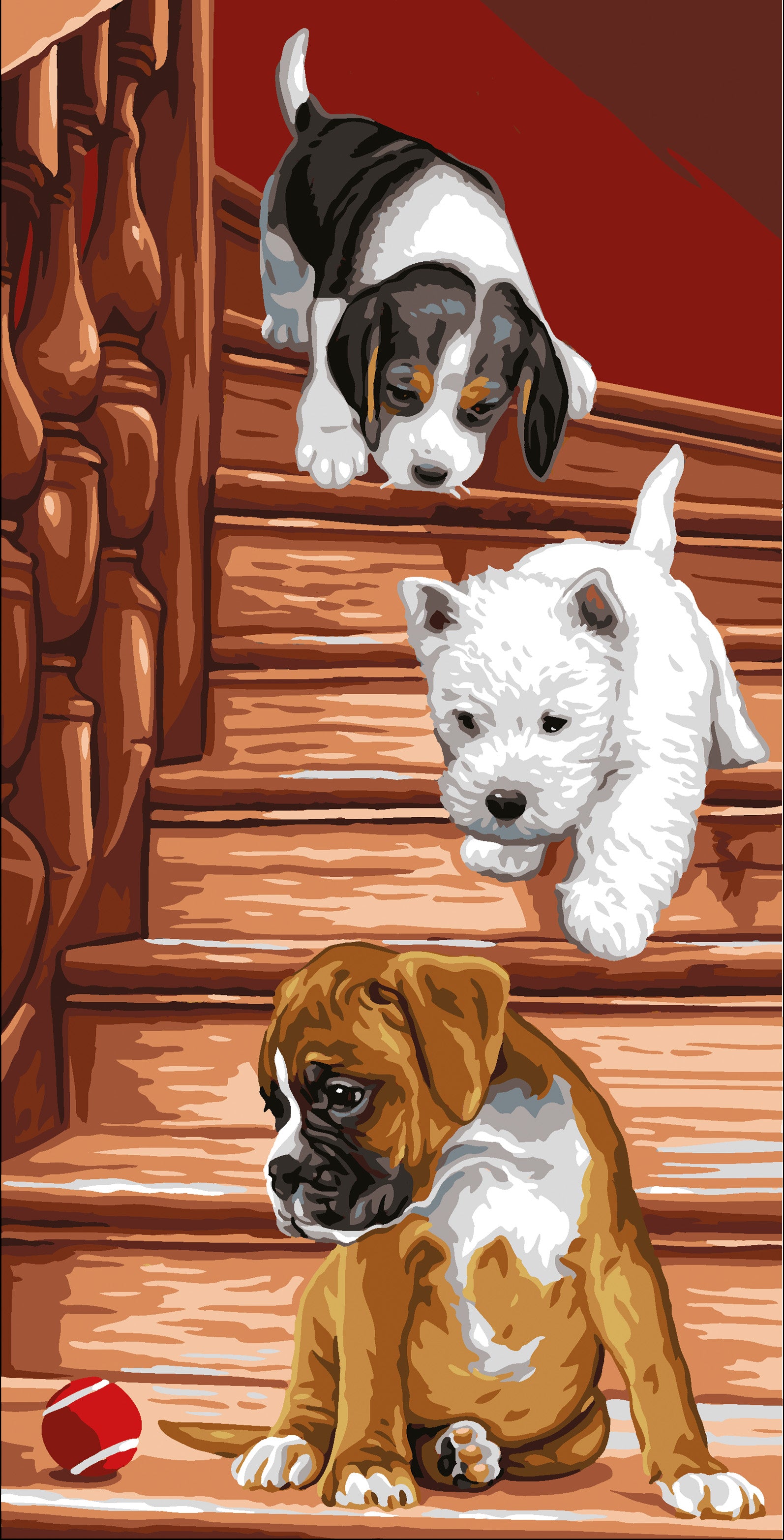 This detailed canvas features three adorable puppies playing on the stairs. Your finished piece will look beautiful framed on a wall. Suitable for experienced stitchers. Our designs are printed on a 100% cotton canvas.